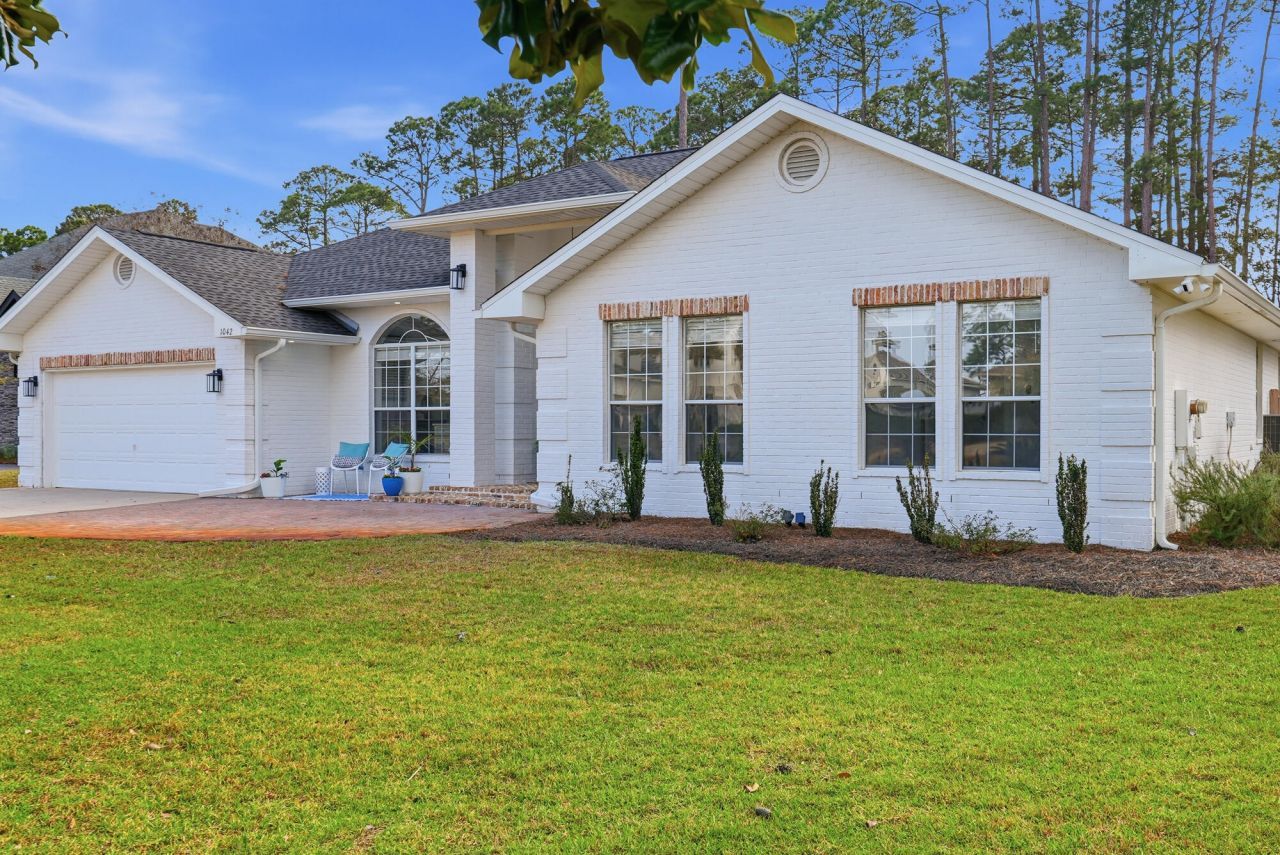 Beautifully remodeled custom home in Driftwood Estates with timeless curb appeal and upscale finishes throughout. The painted brick exterior, brick paver entry, and custom wood double front doors create an inviting first impression. Inside, enjoy a chef's kitchen with waterfall quartz island, full slab backsplash, custom cabinetry, wine refrigerator, pot filler, and a premium gas range. Open living features wide-plank tile flooring, shiplap accents, tray ceilings, and designer lighting. A private home office with built-ins and glass French doors adds flexibility. The primary suite offers a spa-style bath with soaking tub and oversized shower. Large pantry, custom laundry room, and a private backyard with mature trees complete this move-in-ready home near South Walton beaches. Completely remodeled and shows like new construction. High-end details throughout including custom cabinetry, quartz countertops, full slab kitchen backsplash, waterfall island, wine fridge, pot filler, and ZLINE gas range with statement vent hood. Dedicated home office with custom built-ins and French doors, perfect for remote work. Spa-inspired primary bath with freestanding tub and oversized walk-in shower. Thoughtfully designed pantry and laundry room with sink and storage. Private backyard with mature landscaping.