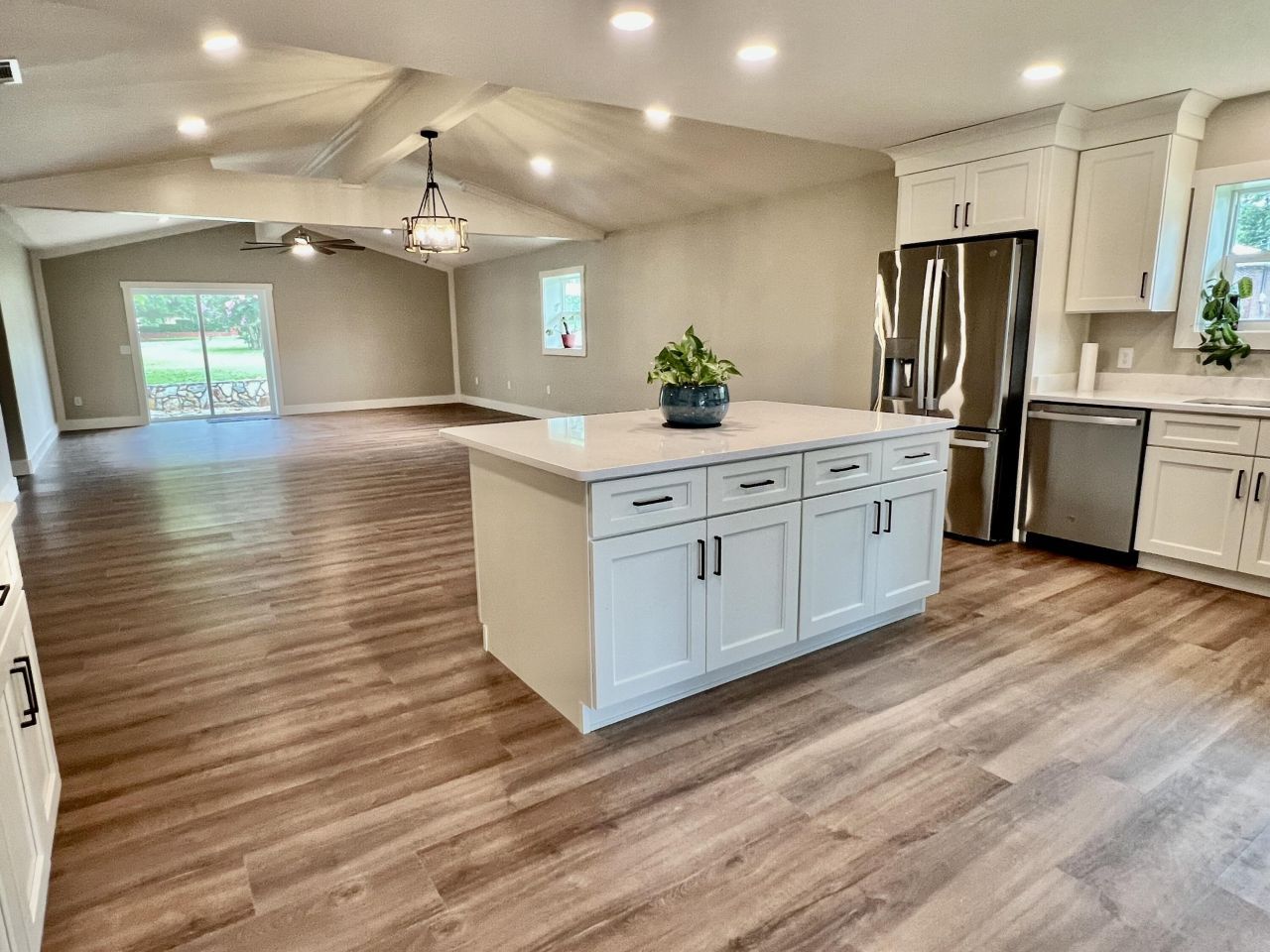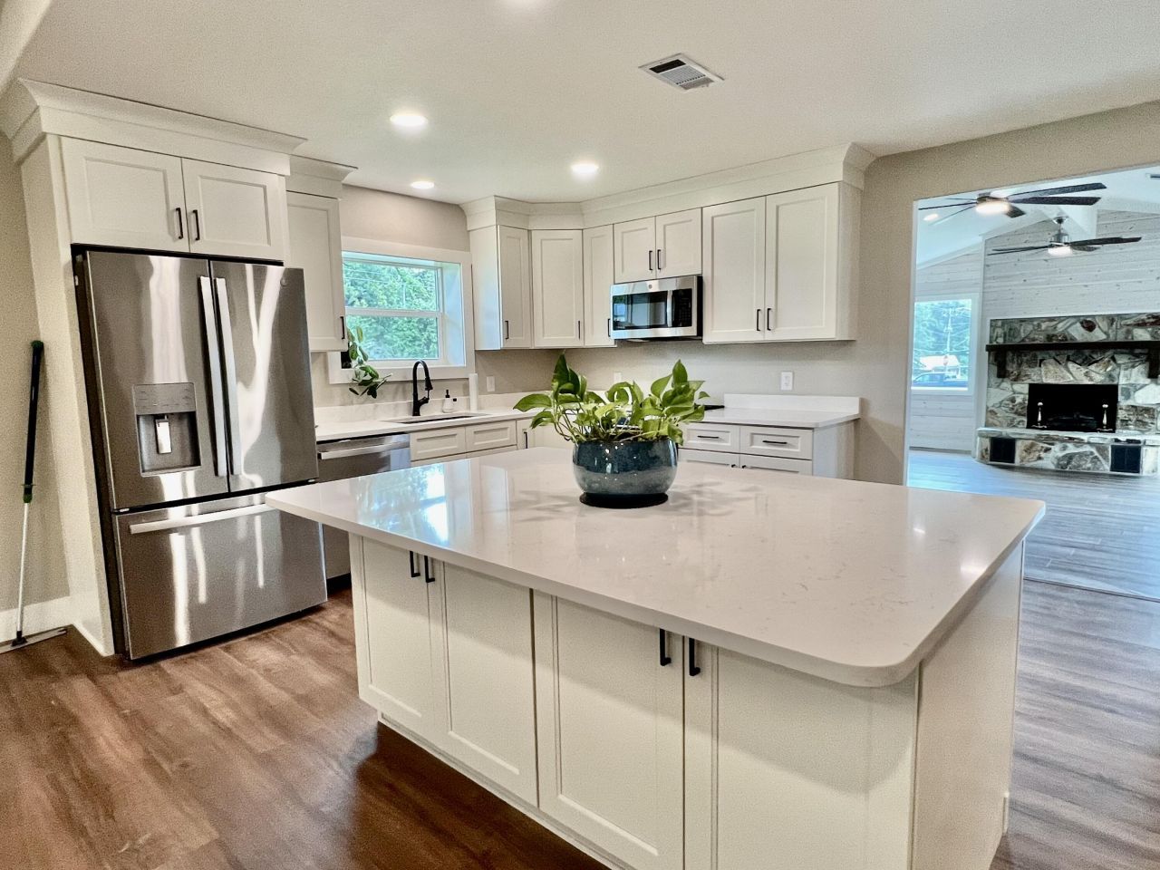Welcome to a beautifully reimagined home--fresh, bright, and fully transformed from top to bottom. Open concept design great for large family gatherings, entertaining, and even a little dancing. This gorgeous home features a magnificent chef's kitchen with an impressive island, quartz countertops, plenty of cabinetry, bar seating, and brand-new appliances--including refrigerator. A gas fireplace greets you in the front family room, just off the courtyard entry, with beautiful large windows. Spacious master suite with walk-in closet and stunning bath. LVP flooring throughout, large laundry/utility room, and oversized 2-car garage with keypad. New roof, HVAC, hot water heater, and more! Huge corner lot with a charming courtyard and a storage building. Seller Offering $10,000 concession.
