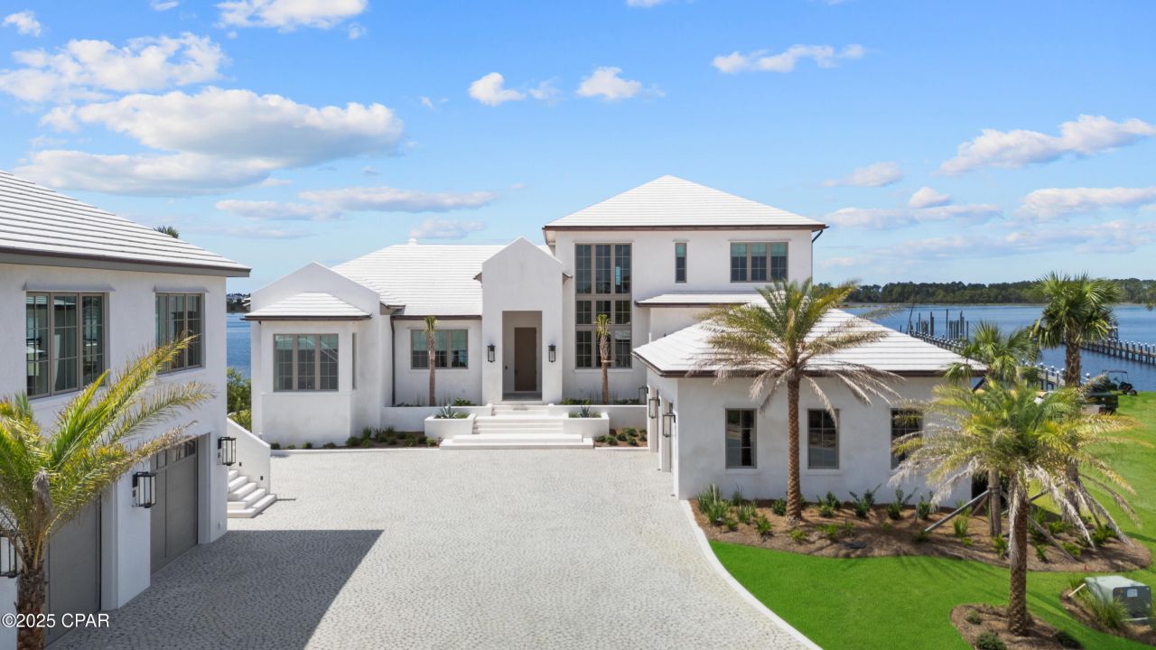 This is a WATERFRONT home that transcends expectations and delivers privacy over prestige?exuding quiet, effortless luxury. Tucked away on a private island of 381' of shoreline in Panama City, Florida, this 2025 newly constructed residence is more than just a home. . . it's a legacy. A rare blend of architectural brilliance, natural beauty, and elevated craftsmanship, this estate redefines coastal living. Designed by Wes Seaborn, built by McIntosh-Myers Construction, and curated by Lori Faison Interiors, every element was intentionally crafted to support a lifestyle of beauty, comfort, and refinement. The design is rooted in organic minimalism, elegant in simplicity, yet rich in warmth and texture. A 12' impact-rated mahogany door opens to a soft palette of Venetian plaster, shellstone, and white oak select throughout. Light dances across barreled plaster hallways with fused-in lighting beneath. It's a quiet symphony of detail. Subtle, yet unforgettable. The vaulted living room is clad in white oak select with a fluted plaster fireplace and Nano doors that open to a sprawling covered lanai. The adjoining dining room, wet bar, and open kitchen invite gatherings, centered around paneled SubZero and Miele appliances, concrete countertops with fused-in sinks, and custom EF San Juan cabinetry. A remarkable scullery and discreet storage keep the space functional yet clean?perfect for entertaining or daily life. Spanning 5,364 SF of heated/cooled space and 8,543 SF under roof, the main residence exudes a highly desirable floorplan. All bedrooms enjoy breathtaking panoramic water views. Offering seamless Gulf access just 10 nautical miles away, without idle zones slowing you down and pure Bay views. At 14' elevation and built of poured solid concrete, this home is as resilient as it is beautiful. The private primary suite is its own tranquil escape, accessed through a barreled, Venetian plaster backlit hallway. Inside, you'll find motorized drapes, a beverage fridge, and a steam shower and soaking tub that will take you straight to the spa. Step through to your private lanai and fireplace for pure relaxation. With four spacious bedrooms, four full en suite baths, and two half baths, there's space for hosting without compromising privacy. A dedicated home office wrapped in oak and plaster, oversized laundry with dual washers/dryers, and a thoughtful mudroom with custom lockers make daily routines effortless. Step outside to the covered lanai and unwind by the outdoor fireplace or summer kitchen. The negative-edge pool is a work of art fused with design. Custom tile-lined, stone-surrounded, and built with a chiller/heater, trough-style drains, and no skimmer for a clean, seamless finish. But the performance is just as impressive as the design. Featuring a 4-car garage and built atop a two-way slab, the structure features poured CMU block, a concrete roof, copper gutters, Andersen impact-rated windows/doors, and a reinforced safe room with poured concrete and rebar. A 500-gallon buried propane tank powers key systems, supported by three HVAC units, three tankless water heaters with circulating pump, a generator-ready transfer switch, and a deep irrigation well. Every detail reflects a level of quality rarely seen?fused-in window and baseboard trim, concealed backlit air returns, modern custom Boyd lighting, solid concrete countertops, and custom 8' solid doors. The Lutron lighting system offers full customization for every mood and moment. For future expansion or guests, the detached car
