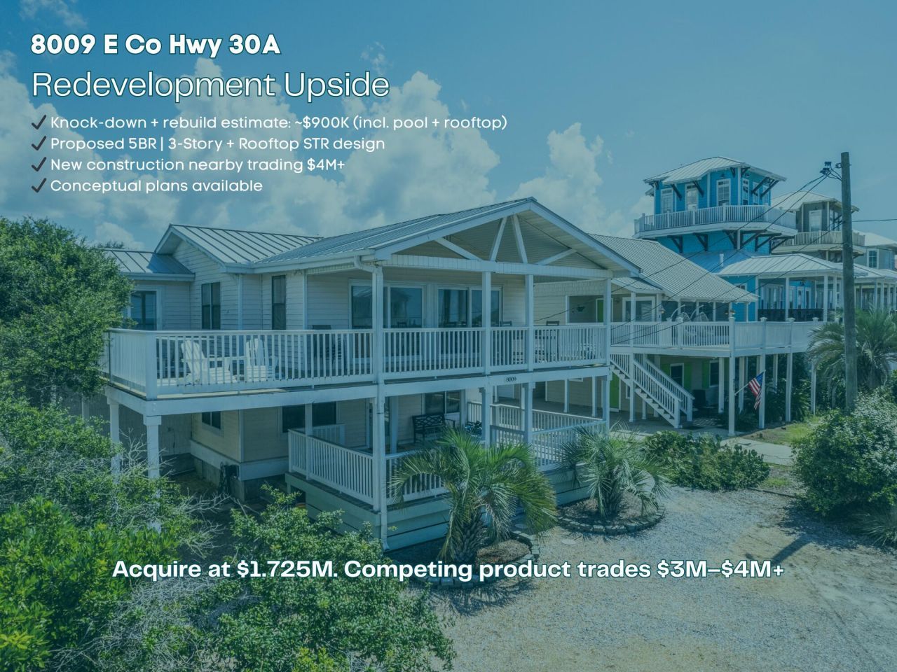 8009 E Co Hwy 30A presents a rare dual-exit investment opportunity in one of the most sought-after STR corridors on East 30A.Offered at $1,725,000, this property is currently operating as a 5-bedroom short-term rental with a private pool no HOA, and strong income performance, while also offering compelling redevelopment upside.Income Snapshot:? 2025 Gross Revenue: $143,773? AirDNA projected revenue: ~$159K+? Submarket Score: 87 (Rosemary/Seacrest corridor)With full-year availability and optimized marketing, this asset supports continued cash flow while evaluating long-term repositioning. Conceptual plans available for a luxury 5-bedroom, 3-story + rooftop design with private pool. New construction in this immediate East 30A corridor is trading in the $3M-$4M+ range depending on finish level and positioning.The property offers:- Walkable public beach access- Private fenced pool- No HOA- STR-friendly location- Strong East 30A positioning between Alys Beach and WatersoundInvestors can operate for income now and rebuild later, or reposition immediately to capitalize on new construction pricing in this high-demand corridor.Full investor package available upon request, including AirDNA data, conceptual plans, and nearby new-build sales. Agents check documents section for data. HVAC and Hot Water Heater were replaced in 2022.