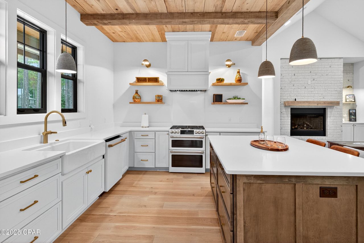 Rare opportunity to own a gorgeous, custom home, built on grade, in the gated, waterfront community of RiverCamps. Built by CNC Construction in 2024 this home is 2719 sq ft. 4 bedrooms and 3. 5 baths and is loaded with upgrades. Cypress wood ceiling in the foyer and kitchen. White Oak wood flooring throughout. White brick gas fireplace for those chilly Florida winter nights. The kitchen overlooks the expansive dining and living area with a cathedral ceiling. Solid wood cabinetry with soft close doors and drawers. GE Cafe appliances including gas top range and convection oven. All appliances including the Samsung washer and dryer convey with the sale. A Butler's/Servery area with a large pantry. Solid core doors throughout. Impact windows. Tiled walk-in showers. Nearly 400 sq ft heated and cooled 4th bedroom or flex area with a full bath above the garage ideal for guests, teens, kids' playroom, an office. So many possibilities. 600 sq ft 2-car garage. Screened in back porch. ALL of this located on a quiet . 59-acre Lot next to the community trail system that connects to over 7 miles of trails and boardwalks. RiverCamps consists of 1500 acres, less than 450 homesites on 500 acres with the remaining 1000 acres committed to conservation. Situated on West Bay and Crooked Creek, owners can launch their boat from the community boat ramp and,via West Bay, be to Shell Island and the Gulf in as little as 30 minutes. There is day- use boat slips, boat wash stations and dry boat storage. A campsite, with an adult and kid tent and a bath house along the shores of Crooked Creek. Newly completed zero- entry pool. RiverCamps is unlike any other community in Panama City Beach. Far from the traffic and crowds yet only 10 miles from Pier Park and the famous white sandy beaches and 10 minutes from NW Florida Beaches International Airport. Measurements approximate; buyer to verify all information.